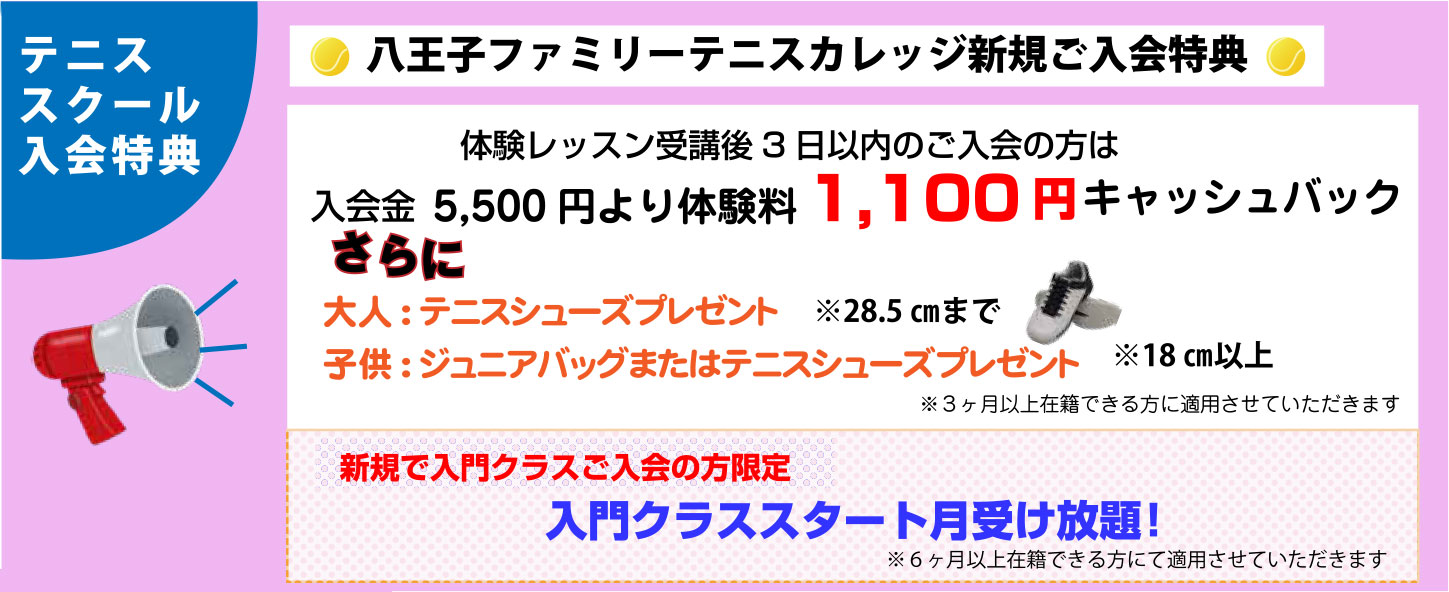 ただいま、八王子ファミリーテニスカレッジでは春の入会キャンペーン実施中です。